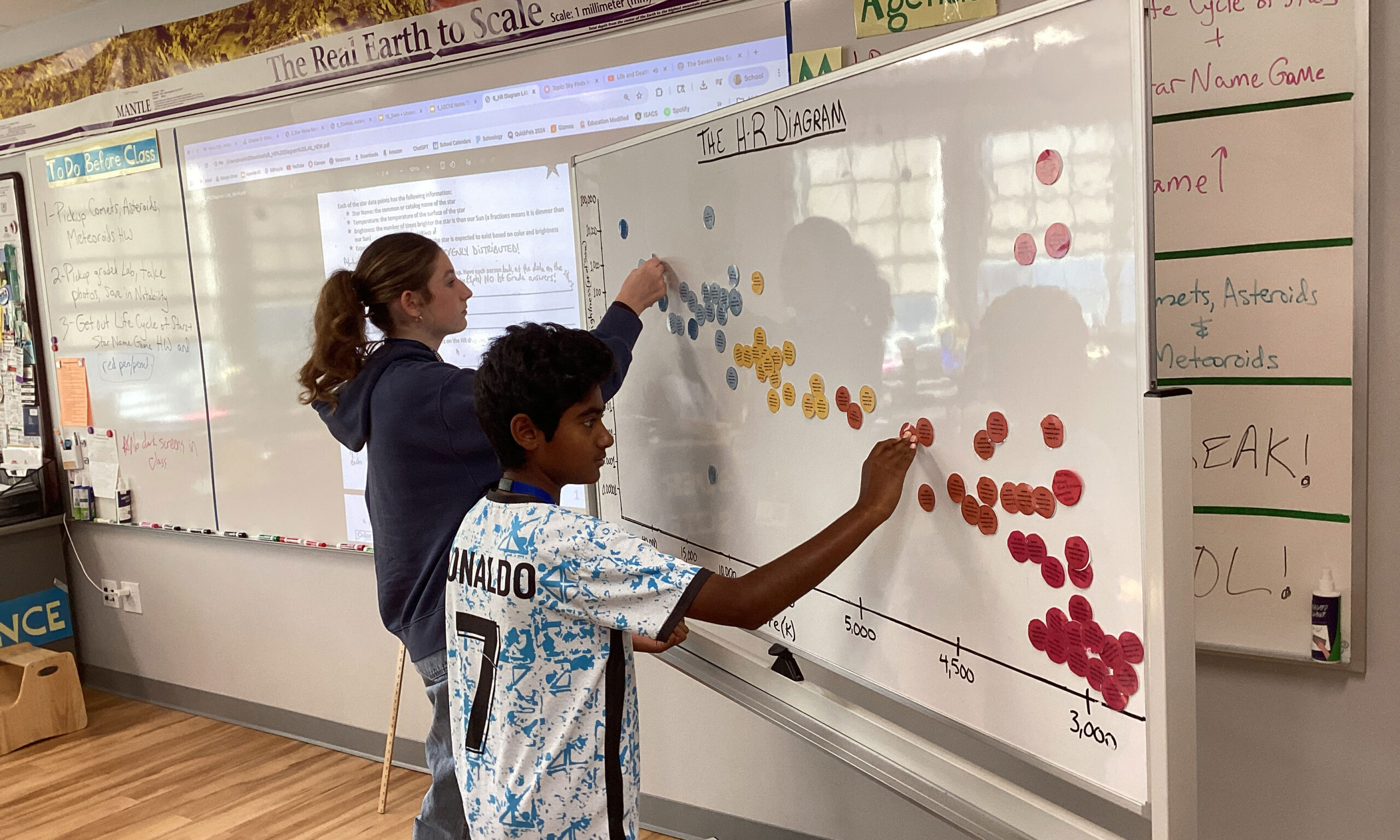 • Seventh graders plot the temperature and luminosity of stars on a Hertzsprung-Russell diagram in science class.